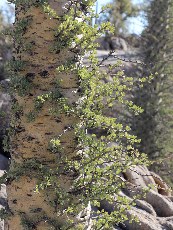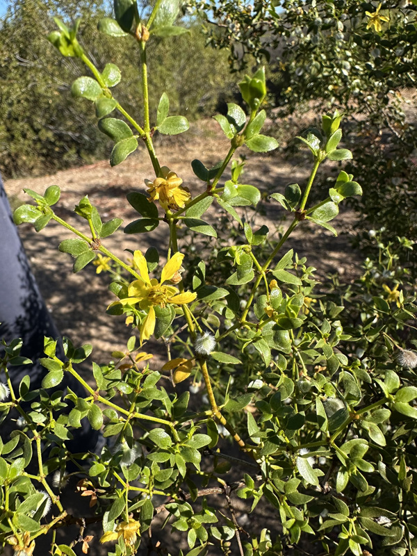 Creosotebush (Larrea tridentata). Last spring before I headed north, many of these aromatic shrubs were losing leaves which had turn olive green to brown because of the 2-3 years of drought.