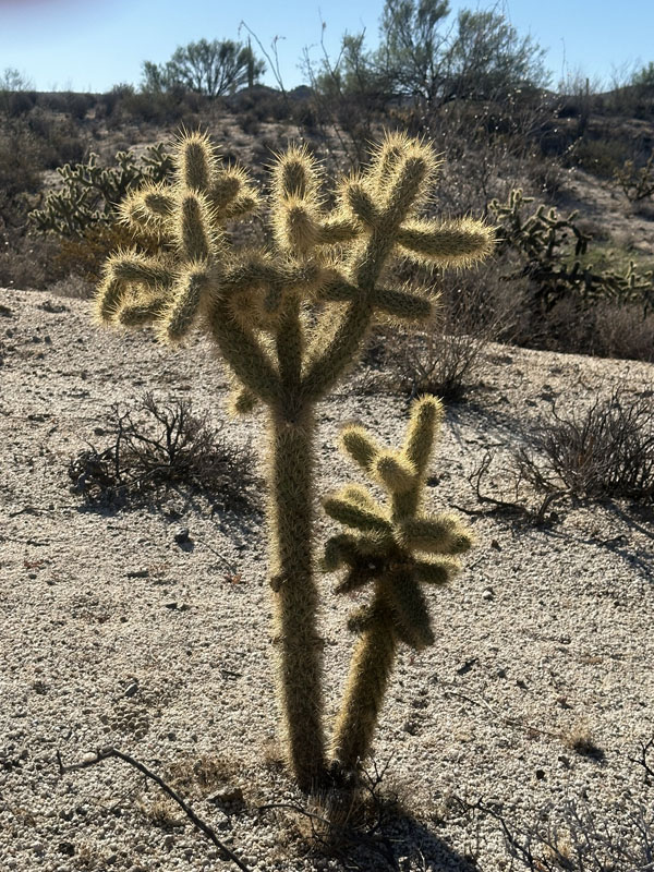 Peninsular Cholla is such a variable species that it can be confusing to ID. This one is about 2 m and like a small tree. Flowers range from yellow to burgundy.