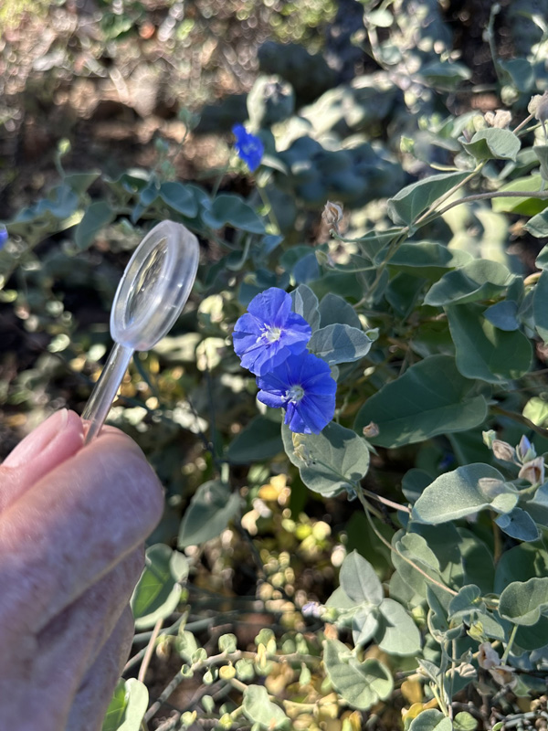 My friend looking at the details of a flower of the endemic shrub Eastwood (or Gulf) Clustervine (Jacquemontia eastwoodiana) for the first time.