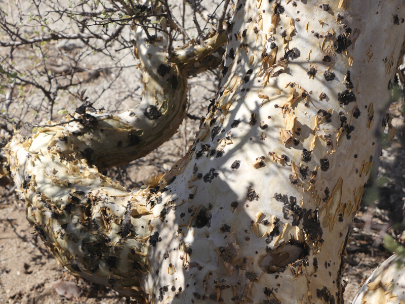 Closeup of the peeling, white to yellow bark of Copalquín (Pachycormus discolor var. pubescens).
