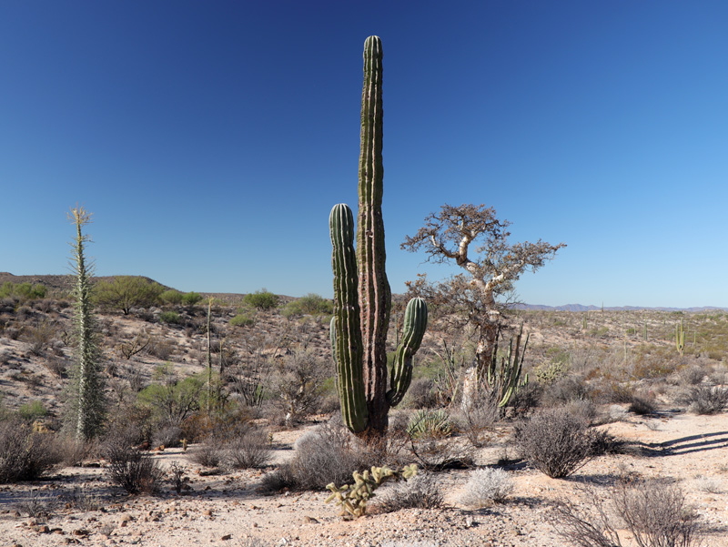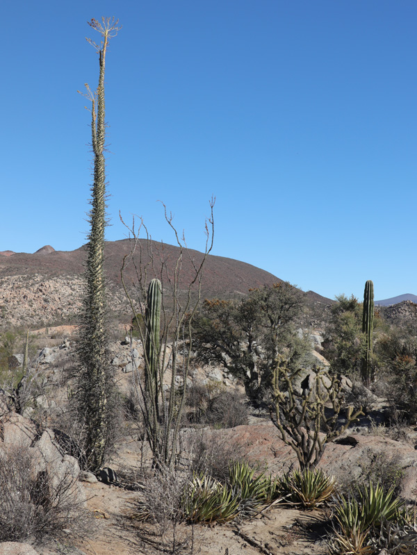 Boojum / Cirio (Fouquieria columnaris), Ocotillo (F. splendens) and a small Elephant Cactus / Cardón (Pachycereus pringlei) at left. Copalquín (Pachycormus discolor var. pubescens) is a tree in the center. Colonial Desert Agave (Agave deserti var. deserti) are in front.