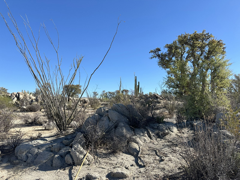 I love Rancho Santa Inés and it's proximity to some boulder fields and an arroyo. I was hoping for signs of the little bit of rain that most of the peninsula had received in late September from a Pacific hurricane/tropical storm. There obviously had been some rain on the Gulf side from Mexicali south beyond San Felipe, but not much. There were a lot of green shrubs, but not really much was blooming and there wasn't a lot of new groundcover. Maybe by January...